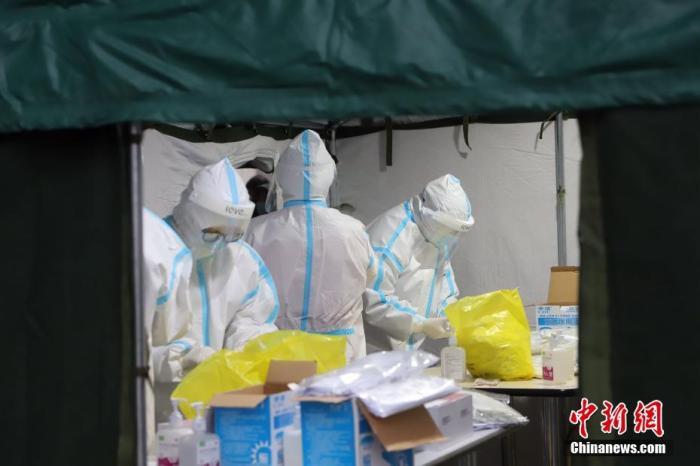 11月21日,受新冠肺炎疫情影响,天津市滨海新区对辖区内全体居民进行大规模核酸检测筛查。图为核酸检测取样现场忙碌的医务工作者。 中新社记者 张道正 摄